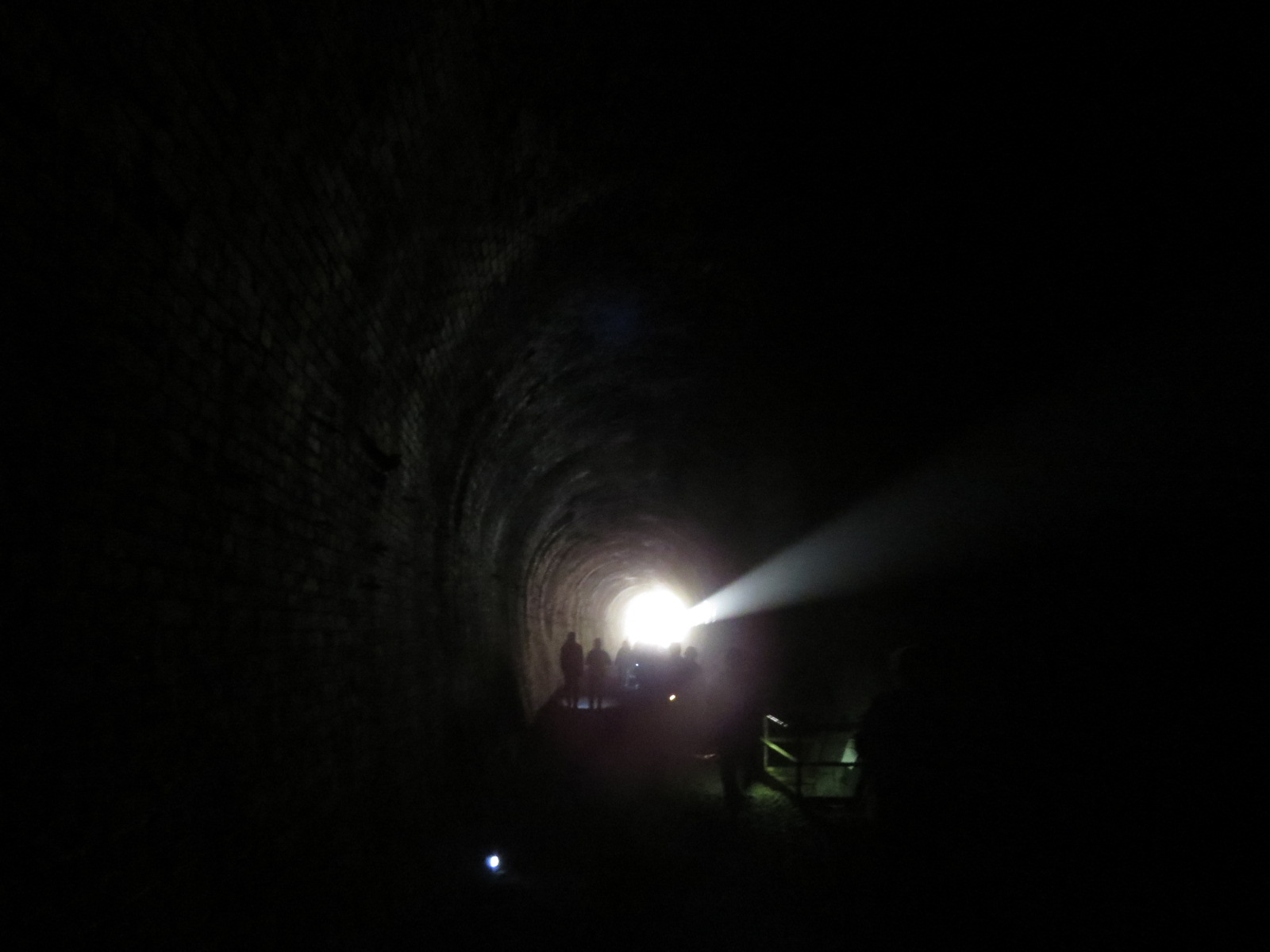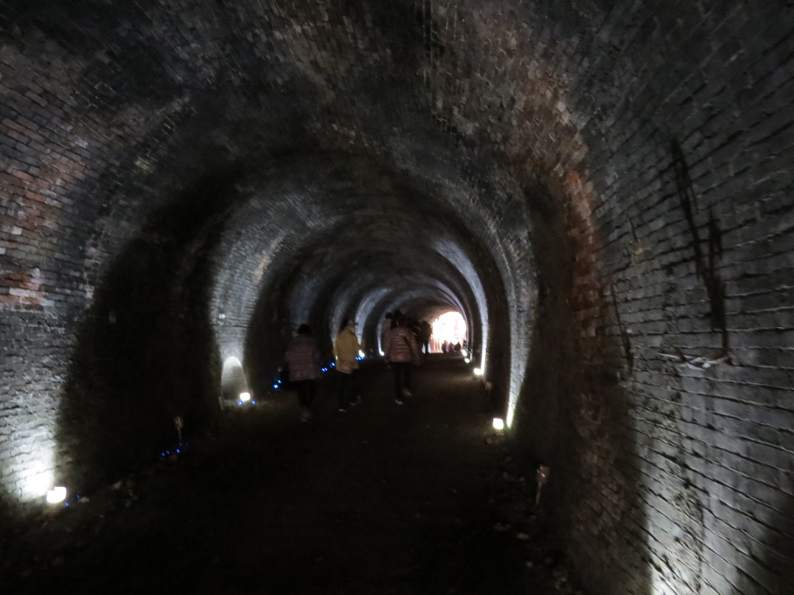 懐中電灯を手に、レールは残っていないためトンネルこそが、廃線の雰囲気を醸し出し、先人が作ったレンガトンネルをSL列車が通っていたことを想像しながら、ゆっくり歩き味わいました。