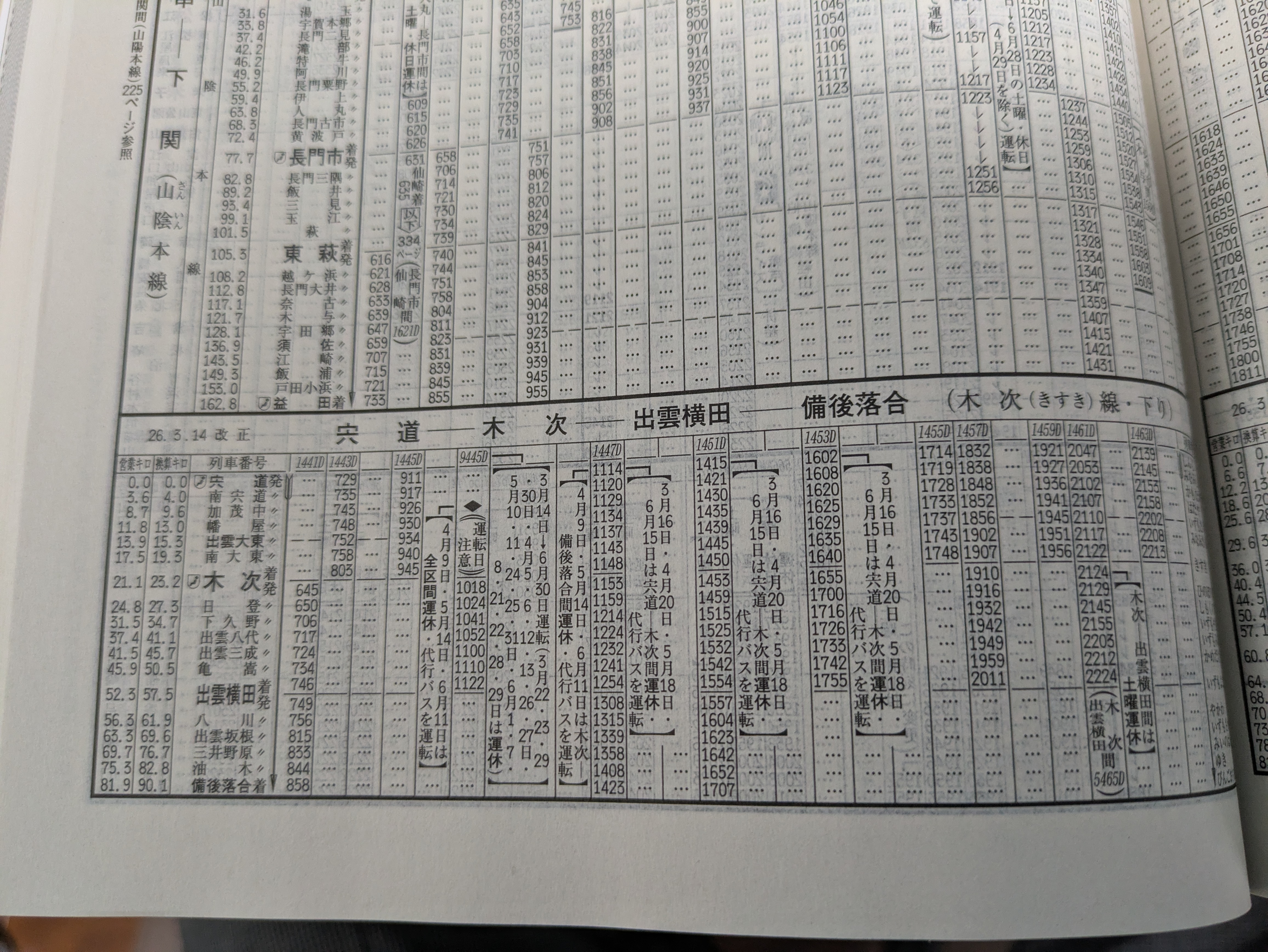 山陰島根の山中にある三段スイッチバックがある木次線(きすきせん)(宍道~備後落合)の1982年と2026年(下さいのみ)の時刻表を見てみました。