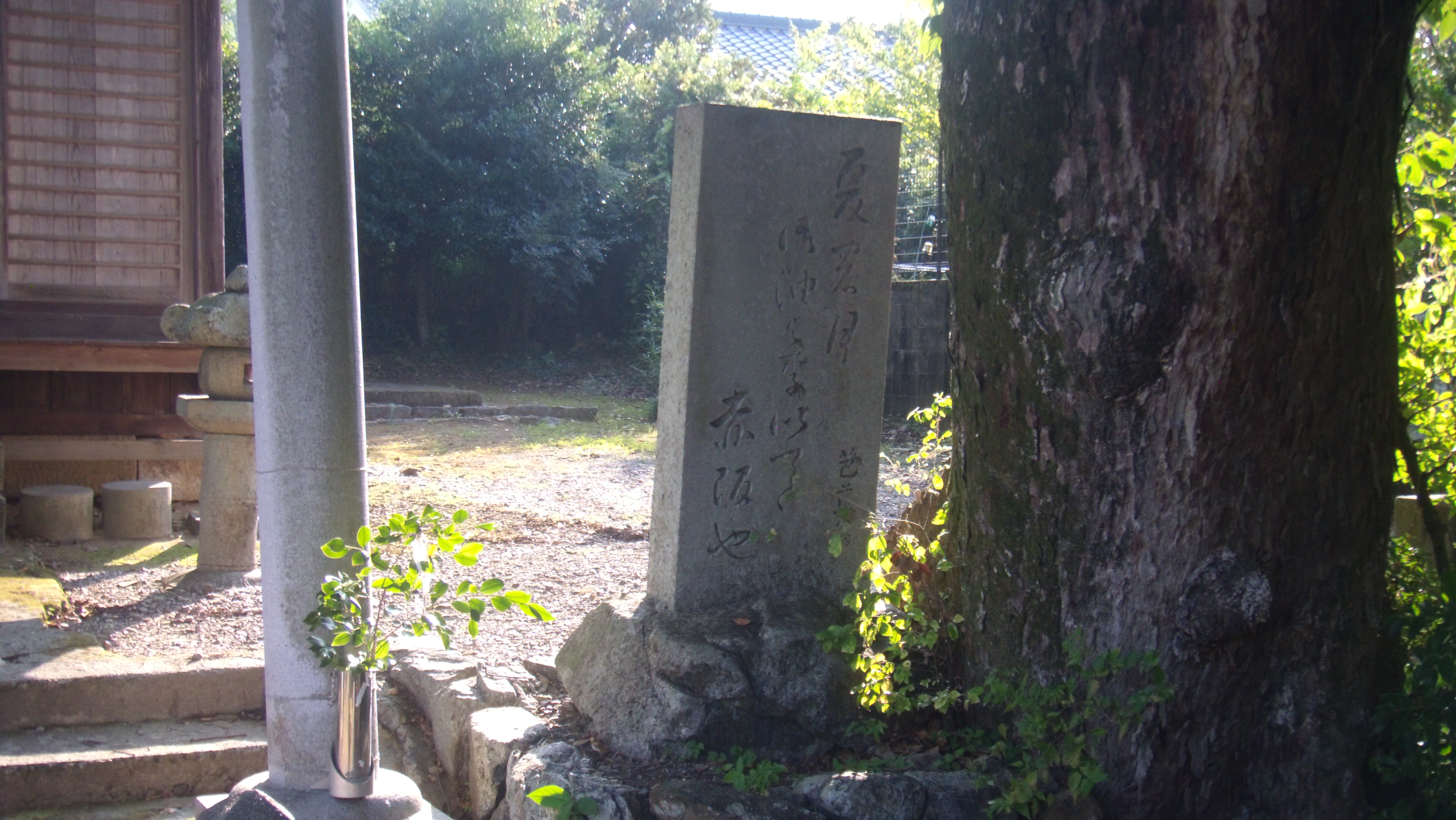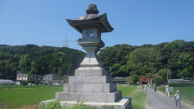 山中八幡宮前の常夜燈、鳥居の向こうに大くすの木